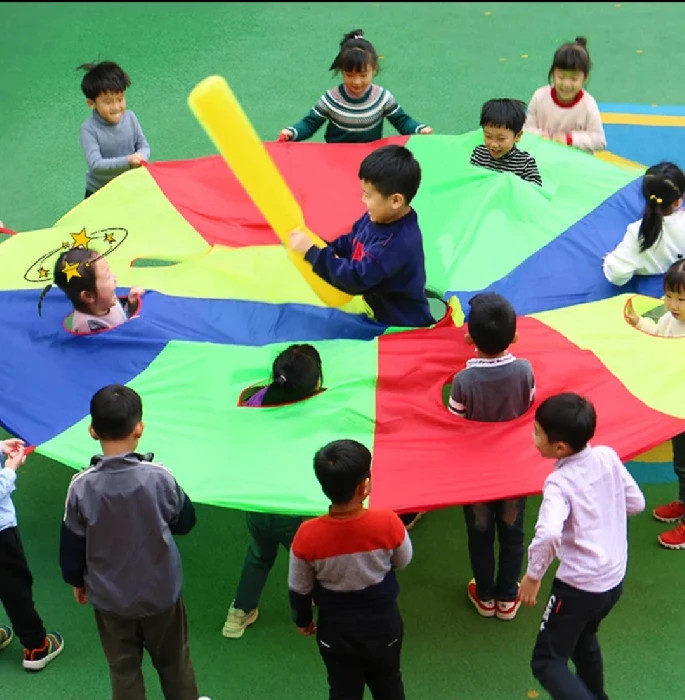 Nagy, szivárványszínű ejtőernyő, amely köré több gyerek áll, és közösen mozgatják, hullámoztatják vagy bújócskát játszanak alatta. Egy gyerek a bújocskázó többieket megpóbálhatja a felfújható ütővel eltalálni. 5–12 éveseknek különösen ajánlott, óvodai foglalkozásokra és családi napokra ideális. Erősen fejleszti az együttműködést, a ritmusérzéket és a csoportkohéziót, hiszen a sikeres játékhoz mindenki összehangolt mozgása szükséges.