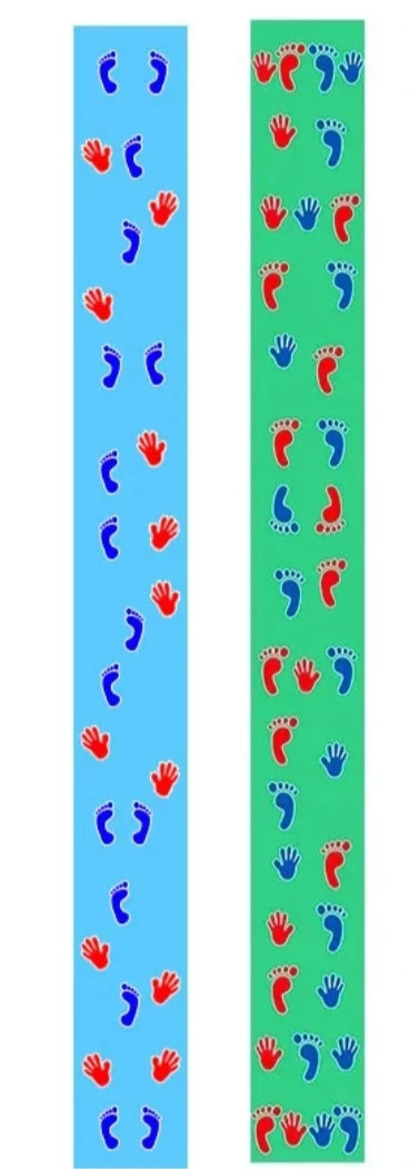 - Két kb. 6 méter hosszú, talajra teríthető kéz- és lábnyom mintás pálya, amelyen a gyerekeknek meghatározott sorrendben kell lépniük és támaszkodniuk. 5–12 éves korosztálynak ajánlott, beltéri és kültéri használatra egyaránt. Kiválóan fejleszti a teljes test koordinációját, a térérzékelést, a figyelemkoncentrációt és a jobb–bal irányok felismerését.