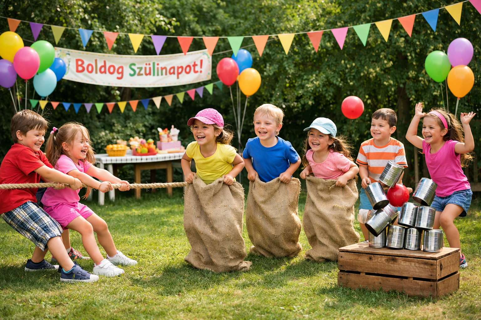 A gyerekek két csapatra oszlanak, és egy erős kötél két végét fogják meg. A pálya közepére jelölést teszünk (pl. bója, kréta- vagy szalagcsík), és az a csapat nyer, amelyik áthúzza a másikat a vonalon. A játék azért vicces, mert mindenki egyszerre feszülten koncentrál, mégis gyakran váratlanul billen el az egyensúly, és az egész csapat nevetve dől a fűbe.